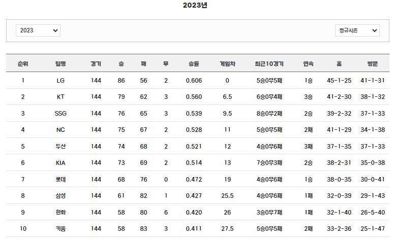 2023 정규시즌 팀순위